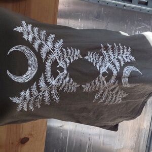 Witchy tank with fern and crescent moon design, olive green color, racerback style. Tag says XXL but I'd say it runs small. Approximate measurements 28" back of neck to bottom hem, bust 19" laid flat.