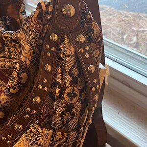 Paisley back ground with navy blue and burgundy. Silky material. Medium size.