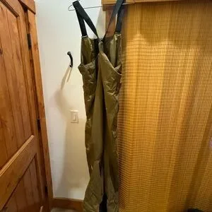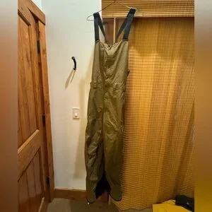 Waterproof ski bibs in excellent condition. This bib is a shell, no insulation. Worn only for one season. Some signs of wear by the bottom cuff of the pants, see pictures. Color is Olive