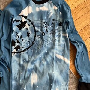 New without tags. Never worn, set of two size 10 pajamas. Long sleeve and long pants. Outer space patterns, smoke/pet free home. My kiddo outgrew before he could use