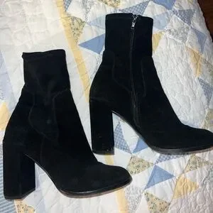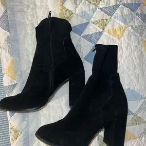 This is a 3.5-4” heel. Black suede ankle high with stretchy material. Rounded toe