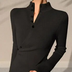 Black Casual Women's Button Cross Design Long Sleeve Sweater Asymmetric Pullover