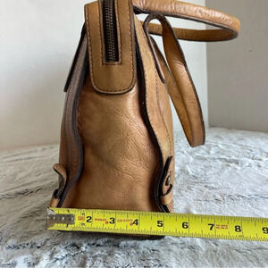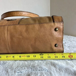 Fossil Vintage Reissue Tan Leather Satchel Shoulder Bag used in good condition, has no rips, it has 2 marks and No scratches on the back. clean interior tag smoke free home measures: 15" w x 10" h x 4"d, handles 9" drop