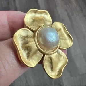 Vintage 80s GIVENCHY Matte Gold Plated Flower Pearl Clip On Statement Earrings
