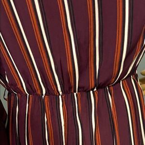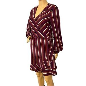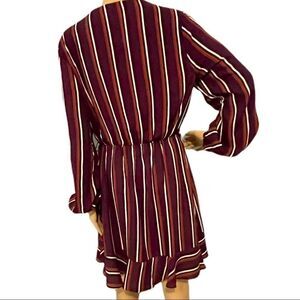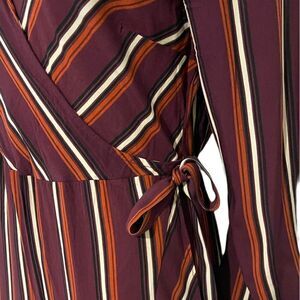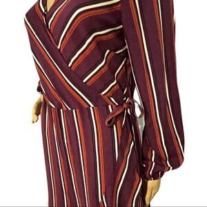 V-Neckline with a mock wrap bust with a snap and a tie bow at the waist