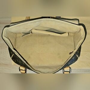 Monogram Beverly GM Handbag. Classic monogram coated canvas with vachetta leather trim and handles. Exterior is in great condition with minor stress cracks (pictured) on the top sides. Exterior slip pocket in the back of the bag. Gold colored brass hardware with a push lock closure. Closure works perfectly. Soft suede interior in great condition with an envelope pocket and a slip pocket. Minor stains (pictured). Beautiful bag. Comes with dust bag.
