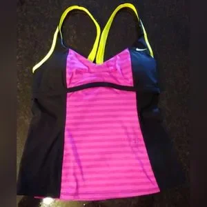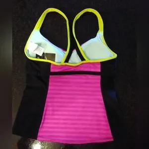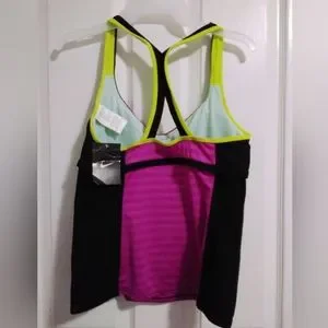 Nike swim tank. New with tags. The tag says size 8/medium. The stripes are pink and purple. The straps have neon green trim