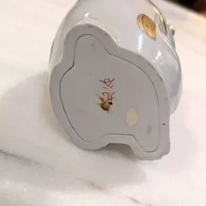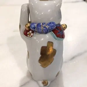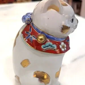 Vintage Japanese Kutani Menecki-neko porcelain cat. The maneki-neko (招き猫, lit. 'beckoning cat') is a common Japanese figurine which is often believed to bring good luck to the owner. Hand painted in folds, maroon, blue and black. In great vintage condition.