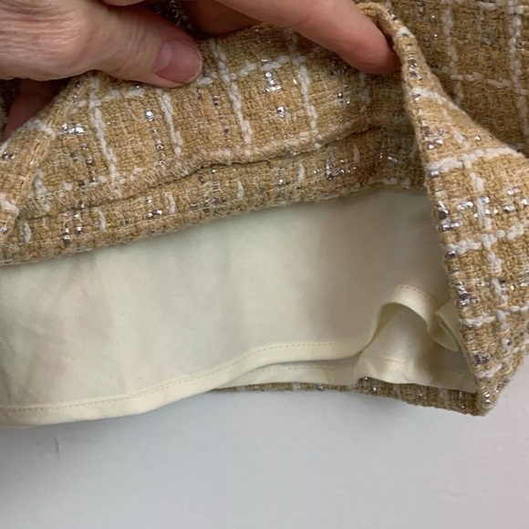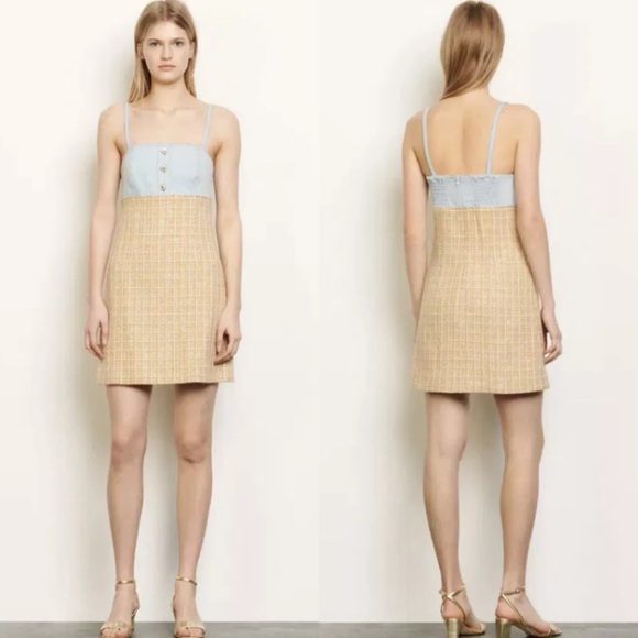 Work-life balance is playfully represented by this two-style minidress topped with a chambray camisole-inspired bodice and finished with a metallic-tweed skirt. Tweed dress with straps.