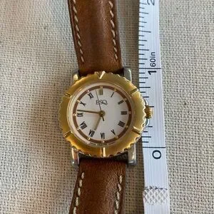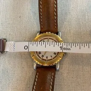 Vintage. Loved watch from ESQ (Esquire Watch Company). Two tone, round face. Water resistant, Swiss quartz movement, stainless steel back. Band shows wear. I didn’t see any scratches on the crystal. Needs battery. See photos for approximate measurements.