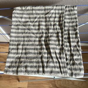 18x18 black and tan denton fabric, ticking stripe with envelope closure. Cotton/rayon blend. Rustic, knobby texture. No tears or stains. Does not include pillow insert. Hand washed cold, line dried. Steaming or ironing will remove wrinkles. Handmade from Etsy shop, no brand tag.
