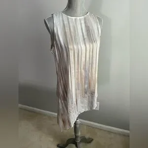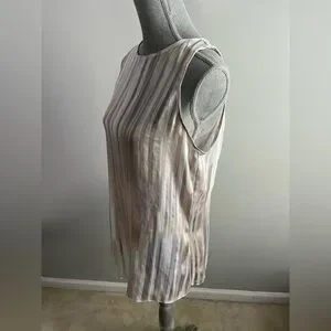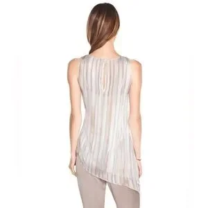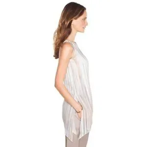 Delicate watercolor stripes make this light, sleeveless tunic so unique. An asymmetric hem falls gracefully past your waist. Pair with slim pants to balance this flowy piece.