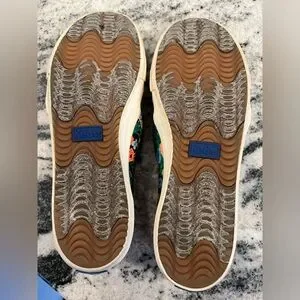 Colorful Blue, Pink & Green Floral Design Upper and White Soles. Tan Leather Strips on the Back . The Inner Soles are Still in Great Shape and Plenty of Traction on the Bottom ! Great Condition. See all pictures.