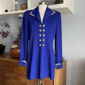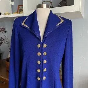 Condition: Great, pre owned. There is a small stain on the front, just above the top left gold button on the edge. See close up photo. Missing a couple tiny blue paillettes on the front collar right side.