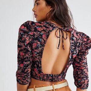 Free People Monica Cropped Top in Black Floral Noir. Cropped length. 3/4 puff shoulder sleeves with ruching.