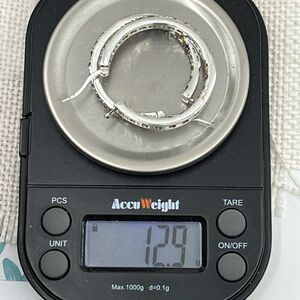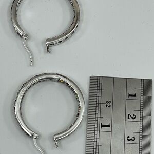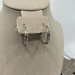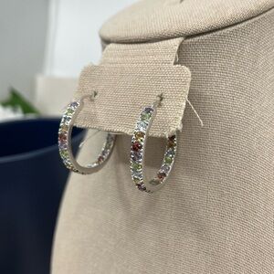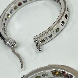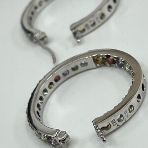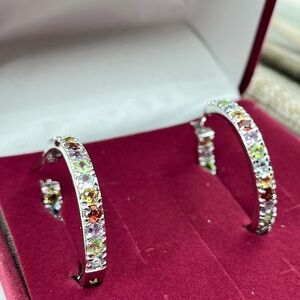 A truly beautiful and unique pair of sterling silver hoop earrings, showcasing vibrant gemstones both on the inside and outside of the hoops. These earrings are part of my estate collection, kept in pristine condition for over 20 years and rarely worn. Weighing 12.9 grams, they offer a perfect balance of elegance and weight, with each gemstone sparkling in a lovely array of colors that brings these hoops to life.