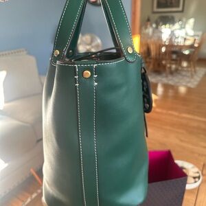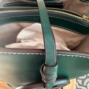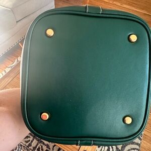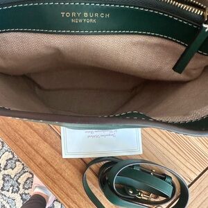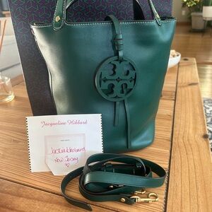 Tory Burch Miller Bucket bag in a beautiful 💚green color💚. Inside is clean, no rips, tears or stains. Comes with its detachable adjustable crossbody strap. Interior has a removable center pouch. Minimal wear. Only flaw I noticed is crack marks in the leather cord (from bending) that holds the medallion. 4" top handle drop and 21.75" crossbody strap drop. 10.25"H x 12.25"L x 7.5"D. Comes comes a smoke free environment.
