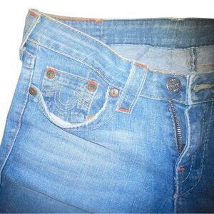 Great pair of vintage True Religion jeans. Moderate wear at leg bottoms in back (see photos). Tags removed but measurements are in line with a size 10-12 (see measurements).