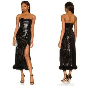 NBD Kalindi Midi Dress in Black Sequin & Feather Trim Size Medium