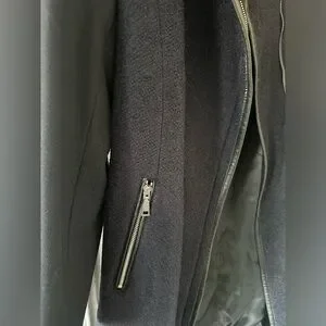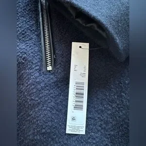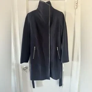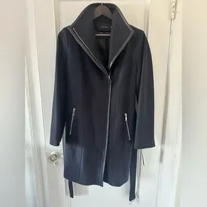 NWT sleek and stylish navy blue mid-length belted wool-blend coat with asymmetrical zipper over boucle and brushed wool body, edged with faux leather trim and contrasting chrome zippers. Front of body is navy boucle-textured wool while inner lapel, sleeves and back are a smooth woolen fabric for warmth. Features two functional front zippered pockets, black faux leather trim and a wool belt with large grommets to cinch at the waist, though coat looks great even without the belt! Interior is fully lined in black polyester with contrasting leopard print piping detail.