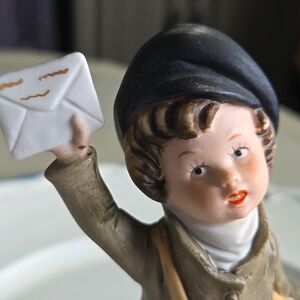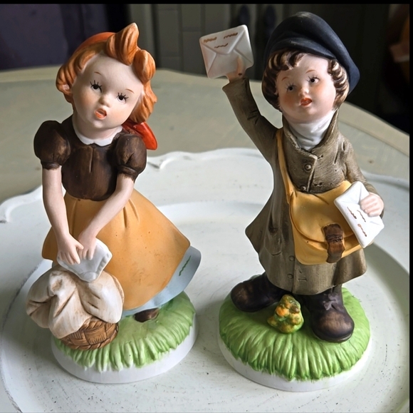 1980's Homco Laundry Girl With Basket & Mail Boy with Mailbag & Letters. #1435AA Porcelain/Ceramic Bisque