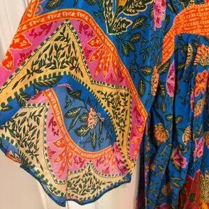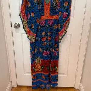 I purchased this fabulous and feminine FARM RIO PINEAPPLE GARDEN MAXI KAFTAN DRESS and NEVER WORE IT! It is NEW WITH TAGS! I LOVE FARM RIO and this dress is gorgeous, and one of the brand's popular Kaftan styles! Unfortunately, it does not fit me properly, as it is too loose for my short frame and the V-neck is too low for my chest. It is slightly HI LOW in length. The pattern is unique, super colorful, and festive. Please view all photos and see our detailed description below: