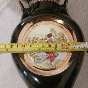 Crafted with meticulous attention to detail, this elegant Chokin vase is a testament to the timeless artistry of Japanese culture. The vase features a stunning 24K gold edge, complementing the intricate design that captures the essence of a woman with an umbrella, rendered in exquisite black on the handle.Its provenance is shrouded in mystery, adding an aura of intrigue to its already captivating aesthetic. Made in Japan, this piece is a celebration of traditional craftsmanship, and its handmade status ensures that no two vases are alike. It's a piece that will effortlessly enhance any space with its blend of cultural richness and sophisticated charm.