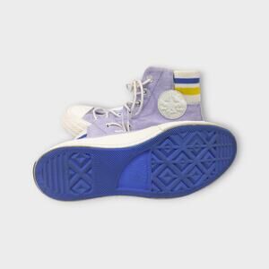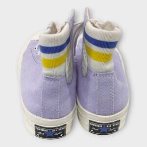 Keywords: Converse, Chuck Taylor, All Star, 70s, high-top sneakers, women's, men's, size 7, size 5, purple, suede, retro, striped, casual, comfortable, vintage style.