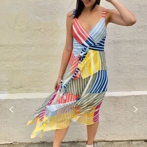 Colorblock striped silk (100% Silk). Hourglass. Sleeveless. V-neckline. Hidden side zipper closure. Fully lined. 38" from shoulder to shortest hemline, 52" from shoulder to longest hemline.