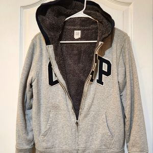 Kids sz 14-16 cozy, cumfy, oh so super soft sweatshirt. Full zipped, full sherpa lined, including hoodie. Good used condition. Small stain on left elbow area. fits kids 10 to 14.