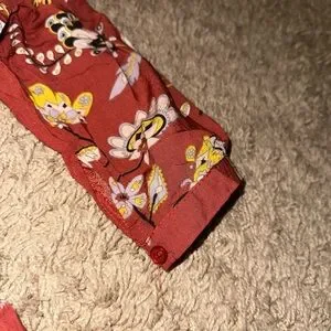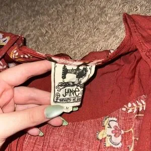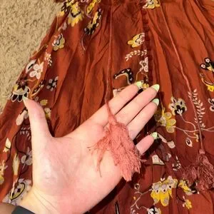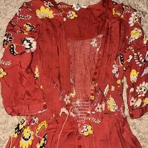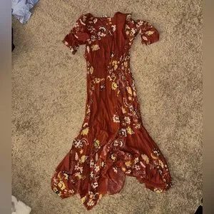 Floral burnt orange dress. Has slit on side, buttons in the front, strings for detailing, worn just a few times