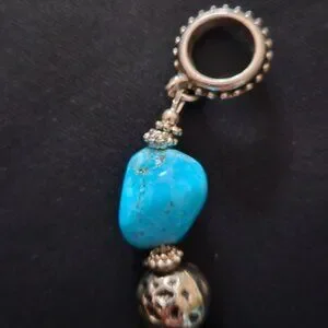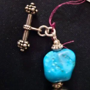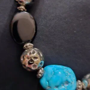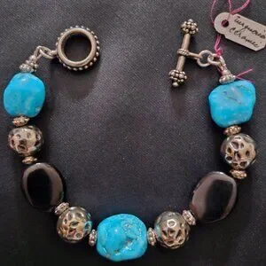 This lovely bracelet was designed and handcrafted by me. It is a unique bracelet featuring semi-precious Blue Turquoise Howlite nuggets, black ceramic beads, and German silver round beads. All findings are silver. The Bali-style toggle clasp is German silver. Howlite is the gemstone of Purity.