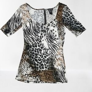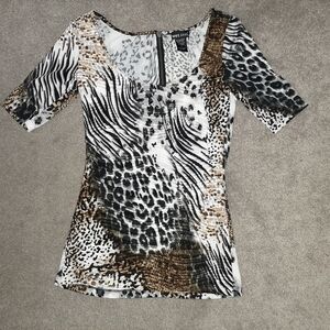 Pictured is a very cute animal print top. This Wet Seal top has a zipper back closure. It is a spandex stretchy cling top. Size small. It is cotton and spandex. Condition is good.