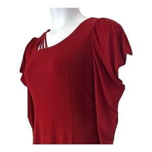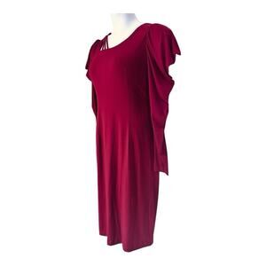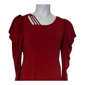 3-season, cool weather styled dress in a year round fabric. Salsa red, spicier than red-red, redder than wine or burgundy. The color is yummy. Luxe knit stretch, long sleeve dress with shoulder seam gathered, retro-romantic Juliet sleeves (fitted; puff at the top) that cowl drape at the upper arm. Scoop neck with strappy detail. Sheath dress style that runs very true to size, shows off your curves without being clingy. Choose a size smaller for a bodycon fit, or size up if you'd prefer something that retains it's curve appeal cut but skims a bit looser. Pullover. 94% polyester/6% spandex. Stretchy. Body of dress is lined, sleeves are unlined. Hand wash.