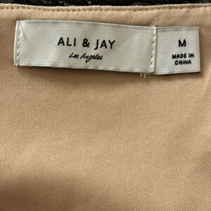 Gorgeous black lace mini dress from Ali & Jay with a flattering fit and romantic details. Lace design with a built-in tan slip, v-neck, hidden side zipper, adjustable spaghetti straps Perfect for a night out, date, party or special occasion! Straps are adjustable. Size M