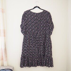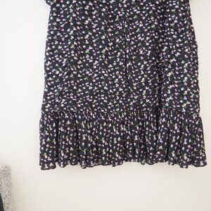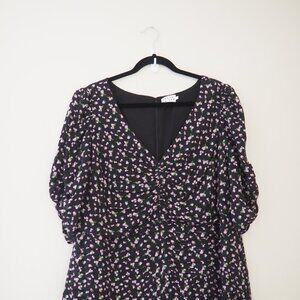 Tanya Taylor Black Floral Pansy Puff Sleeve V-Neck Ruched Flounce Silk Dress sz 22