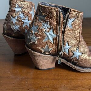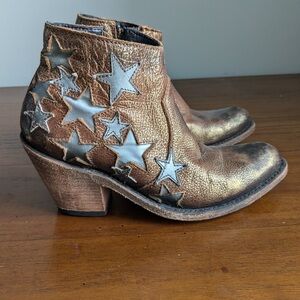 Stylish bronze ankle boots with star embellishments. Features a side zipper for easy wear. Perfect for adding a touch of flair to any outfit.