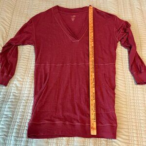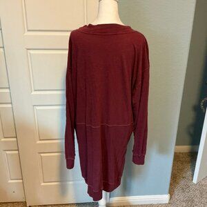 This oversized, comfy mini t-shirt dress from Natural Life is perfect for fall. Long sleeves, white stitching, deep V-neck, dropped sleeves. Dark fuschia purple\pink color.
