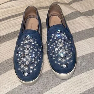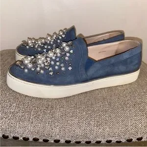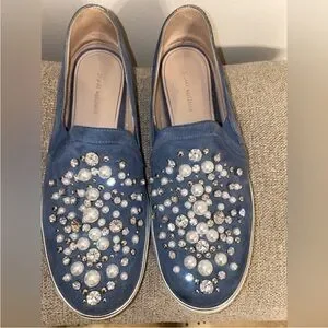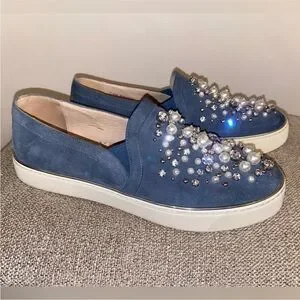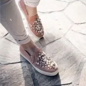 Stuart Weitzman Pearl Crystal Embellished Decor White Platform Sneakers Slip Ons