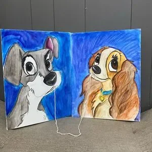 Hand painted watercolor on flat canvas of “Lady and the Tramp”. I added string for spaghetti for a 3 dimensional look.