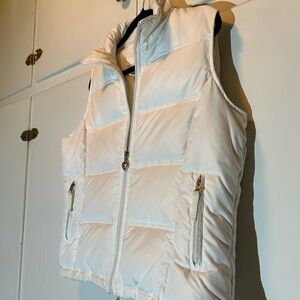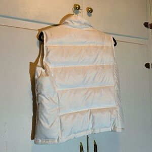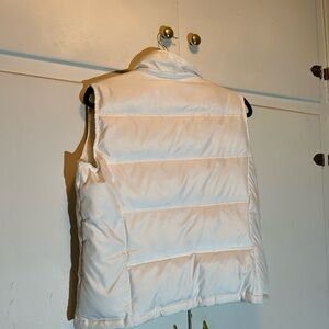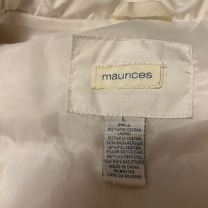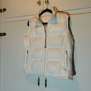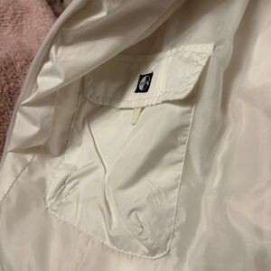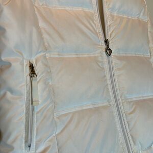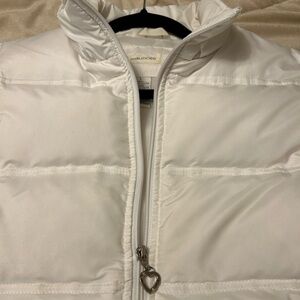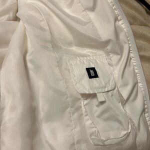 Size L, white two pockets on front and two inside. One for cell phone, other side has a picture of a CD on the pocket. No hood, all zippers work, main zipper has a heart, pre- owned, along a seam inside by cellphone pocket seam open about 3”, they must have sewed to close to seam when making. Clean and in great condition.