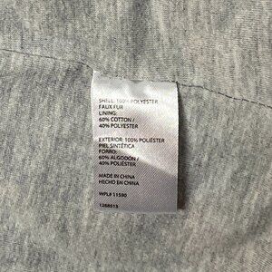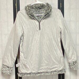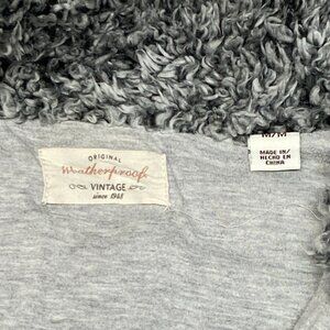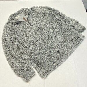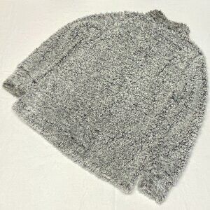Mock Turtle Neck Long Sleeve Imitation Sheared Wool Quarter Zip Sweater from Weatherproof Vintage. Hardly worn, not torn or stained - looks like new. Lightweight long sleeve fuzzy faux sherpa jacket top with relaxed silhouette in marled shades of grey, black and white. Fully lined in soft grey jersey knit. Quarter zip forms mock turtleneck when zipped. Inset pockets at side seams. Wide band at sleeves. Pull on style. Hits upper thigh.