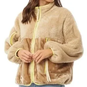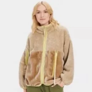 Elevate your everyday with the Marlene - a relaxed, versatile, boxy-fit silhouette with cozy blocked sherpa and faux fur. Offering the feeling of UGG inside and out, this full-zip jacket can be thrown on over virtually anything for an extra layer of softness and style. Full zip sherpa blocked jacket Shell - 100% polyester Lining - 100% cotton partial lining Stand collar Pop color knit binding along center front closure, hem, pocket zipper plackets, and cuffs Iridescent nylon coil zipper with metal and UGG graphic embossed faux suede zipper pull Front and arm pockets with iridescent nylon coil zipper with metal and exaggerated faux suede zipper pulls.
