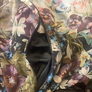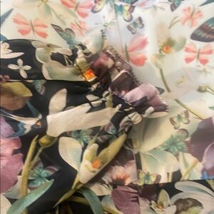 Beautiful, demure dress, perfect for day or night. Lined chiffon floral print with butterflies and swallows. A lovely dress with a hint of modesty. Side zipper, black satin lining in skirt. Like new condition.
