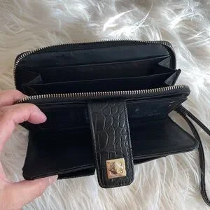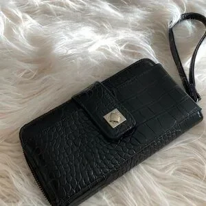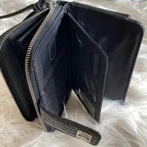 Preowned, used, but still useful, with some signs of wearing, mostly on edges. Have good amount of space for money, card , I'd and pictures, measurements 8"/4", made from faux patent crocodile pattern leather