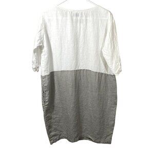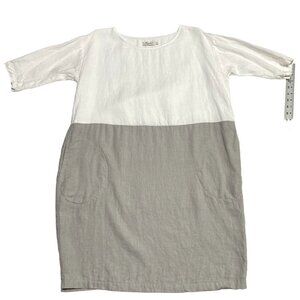 Magic Linen Women's Adria Color Block Linen 3/4 Sleeve Dress Size M White Gray