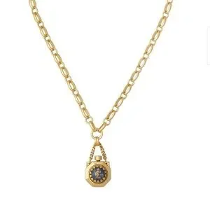 - 24k antique gold plated brass chain adorned with a hand painted vintage zodiac intaglio set on a 24k antique gold plated perfume bottle pendant