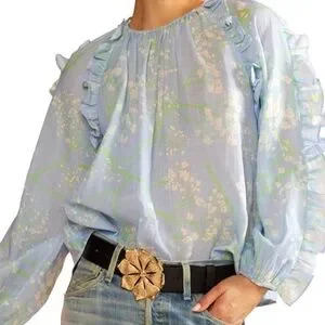 The Claudia Blouse features a baby's breath print and ruffle details, creating a balance between bold and whimsical. Made of ramie, a natural vegetable fiber and a sustainable alternative to silk.
