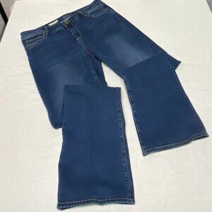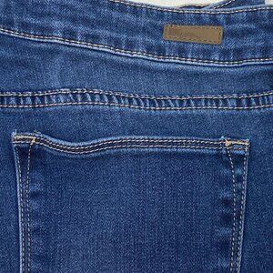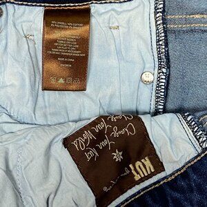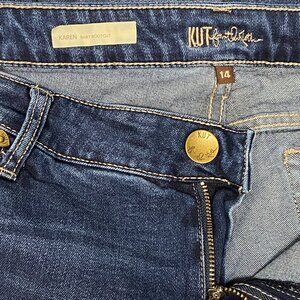 High Rise Boot Cut Karen Faded Jeans from Kut from the Kloth. Gently broken in, not torn or stained - look like new. Midweight cotton with high rise silhouette in medium denim wash. Slim straight waist and thigh with lightly flared lower legs. Belt-loop waistband with button and zip fastening. Classic back yoke, topstitching and 5-pocket design. Leather label on back waist.