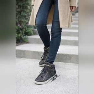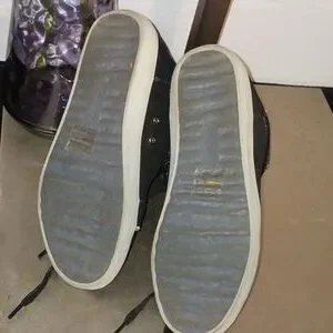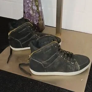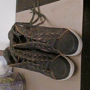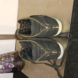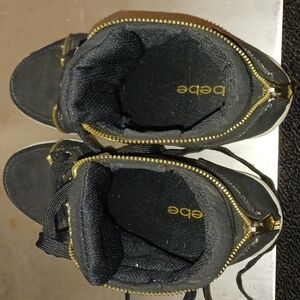 New Bebe sneakers. These sneakers are black with gold shimmer all over the sneakers. There is also a gold zipper that goes from the back all the way to the front. They are one of a kind and make a great statement piece for any outfit.